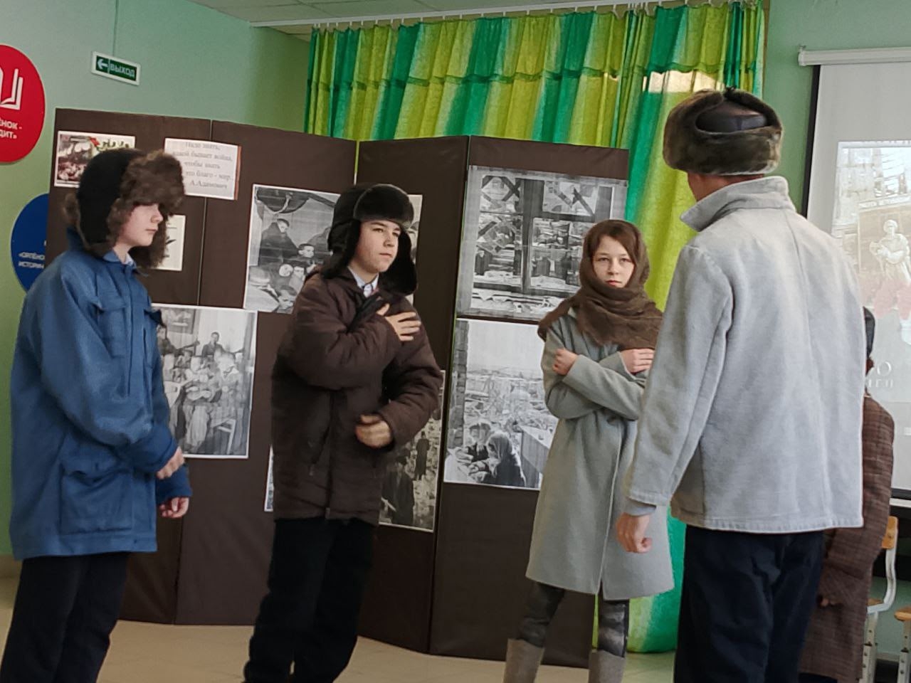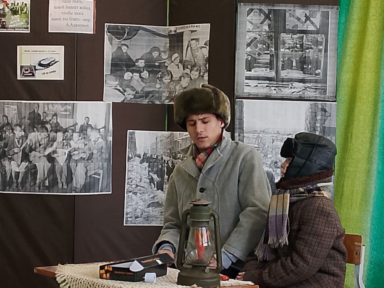 Были сцены в полуразрушенном доме, в бомбоубежище, на улице, под сигнал тревоги. Вторая часть нашего спектакля — это мирное время, но в котором помнят, чтят и передают из поколения в поколение память о Блокаде города на Неве. В нашем спектакле принимала участие Пономарёва Ангелина Владимировна — учитель английского языка, играя роль доброй бабушки, которая рассказывала внукам о собаке Трезоре, как он спасал людей от голода — приносил им зайцев из леса. В конце нашего выступления, со свечами в руках, под проникновенное чтение стихотворения Александра Коробейникова, ребята почтили память погибших минутой молчания.